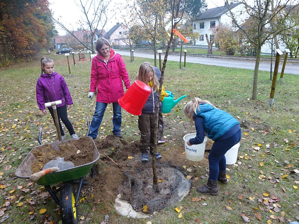 ![]() Als letzter Baum wurde im November 2018 als Ersatz eine “Bosc‘s Flaschenbirne” gepflanzt. Jugendbetreuerin Karin Stubenrauch freut sich, dass die Kinder so eifrig dabei sind und fleißig wässern |