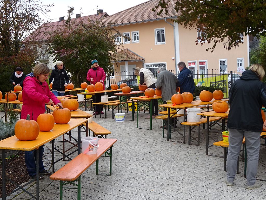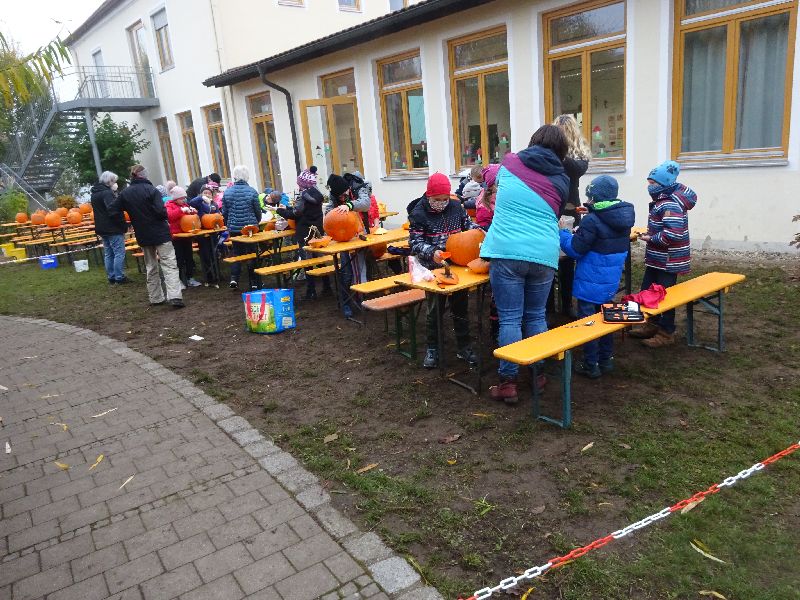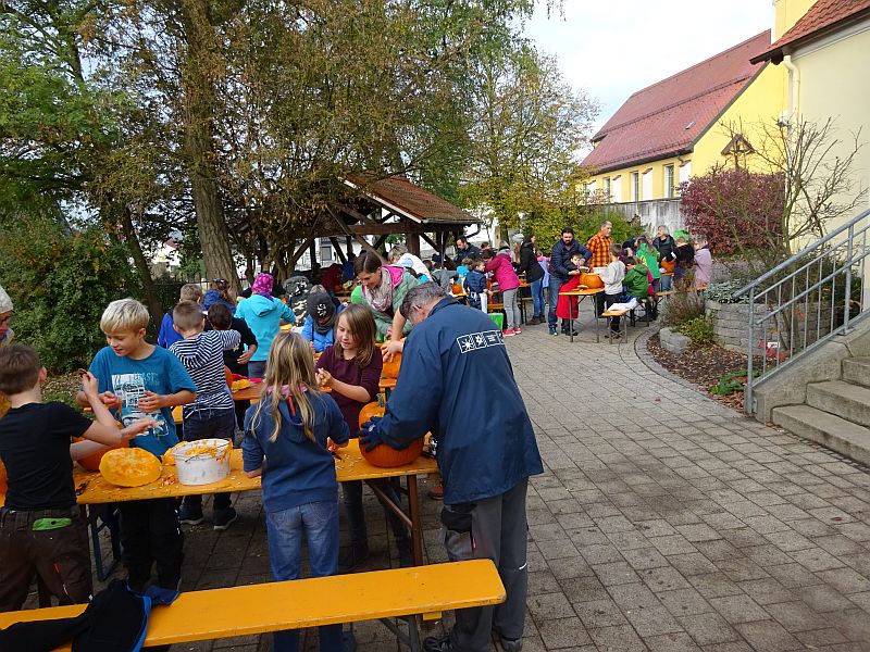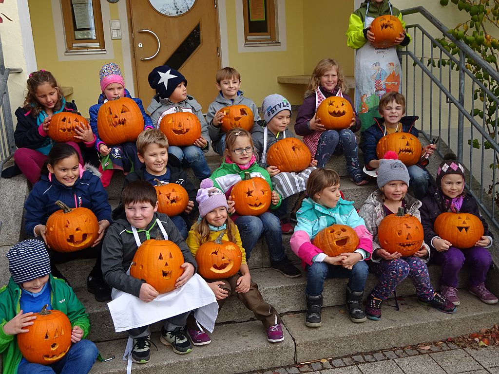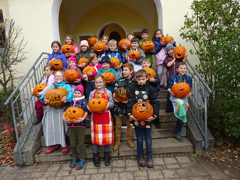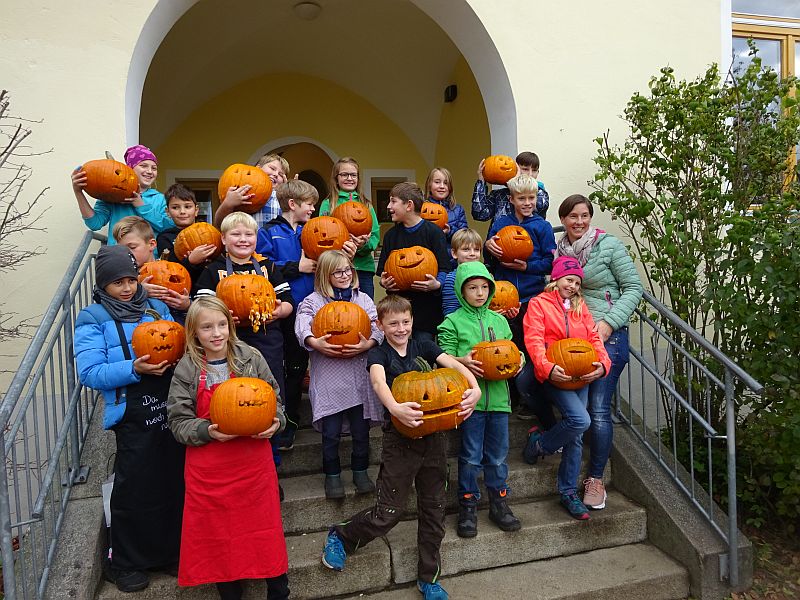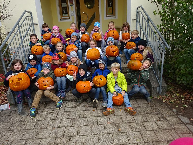 Seit vielen Jahren wird dann im Herbst an der Schule ein Kürbisfest gefeiert. Dabei schnitzen die Kinder der zweiten, dritten und vierten Schulklasse Kürbisfiguren und der OGV spendiert allen Kindern eine Kürbissuppe. Es werden hier im der Klassenstärken entsprechend an die 55 bis 80 Kürbisse benötigt.