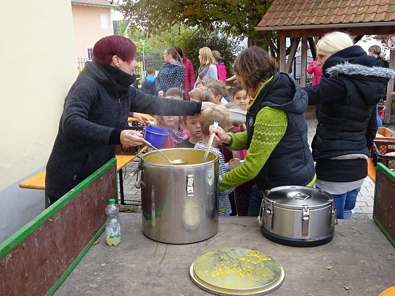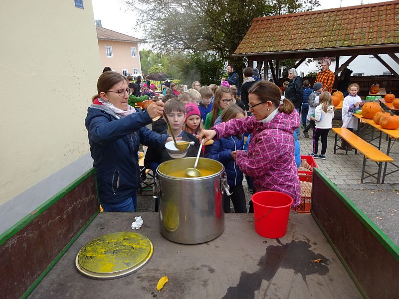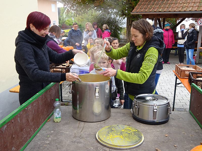 Zum Abschluss des Kürbissfestes gab es für alle Kinder eine leckere Kürbissuppe, die der OGV stiftete. Die Jugendbetreuerinnen Karin Stubenrauch (links) und Maria Pernpeintner konnten aus dem Vollem schöpfen bis alle satt waren.