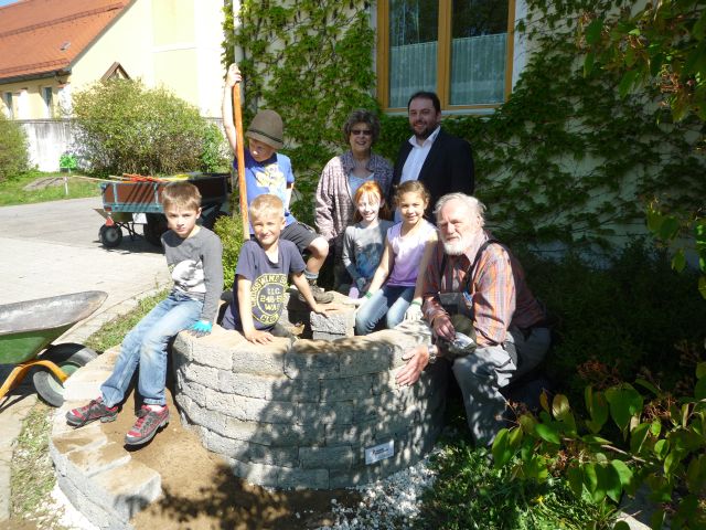 ![]() Nach der Errichtung der Kräuterspirale zum Schulgartentag 2016 waren die Kinder und Erwachsenen stolz auf ihr Werk. Mit dabei Dietmar Pernpeintner von der Firma Raab-Karcher, die das Material sponserte |