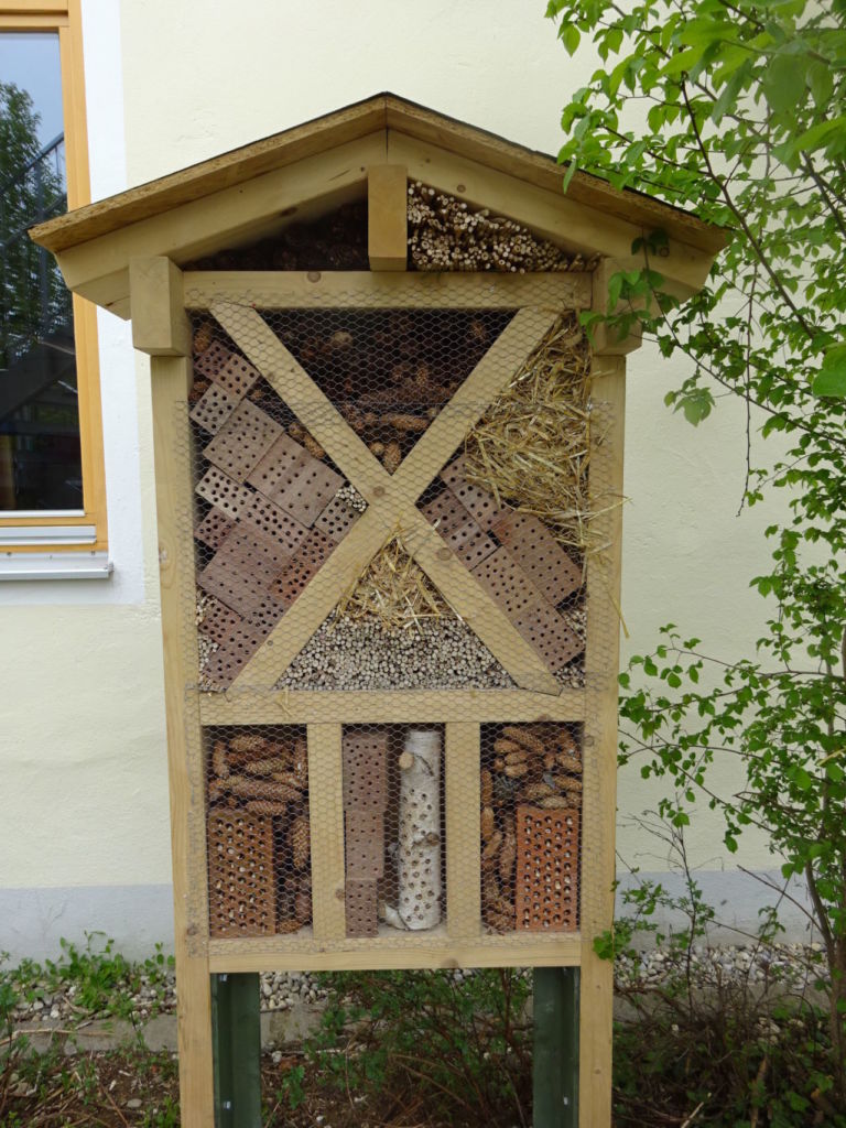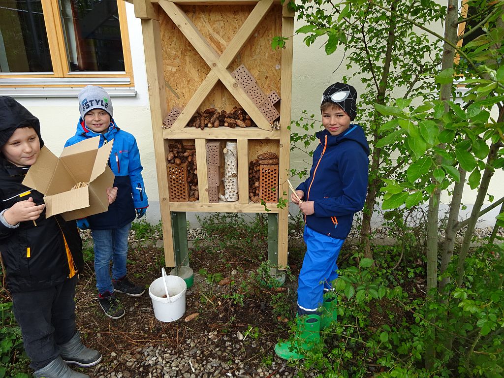 Am 30. April 2019 wurde im Schulgarten bei einer weiteren größeren Aktion beim Schulgartentag ein großes Insektenhotel aufgestellt und von den Kindern mit Eifer bestückt.