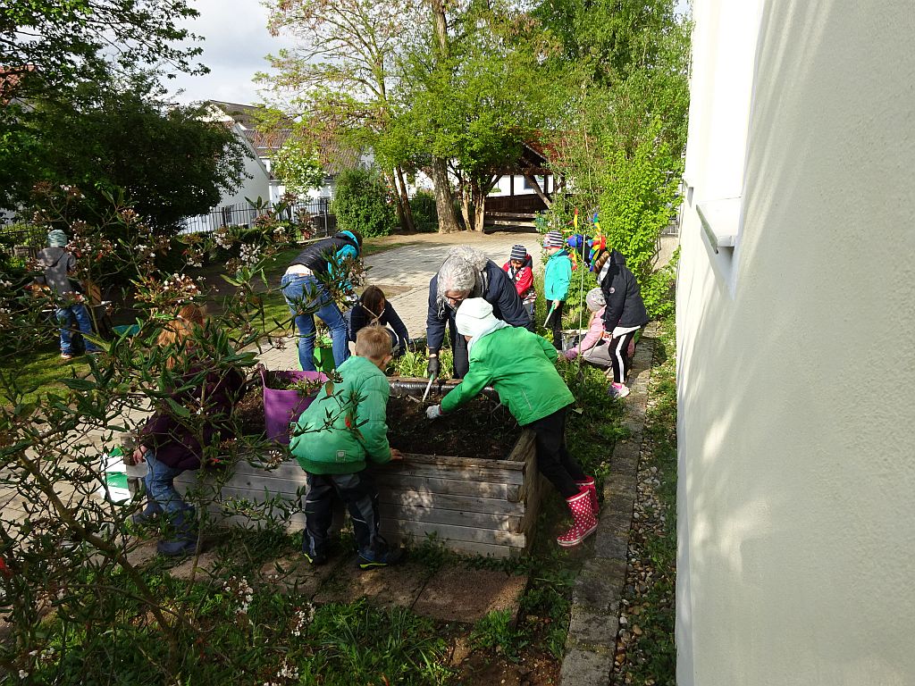 Beim Schulgartentag am 30. April 2019 wurde das Hochbeet und das Blumenbeet bearbeitet und Zwiebel gepflanzt. Können auch für den V