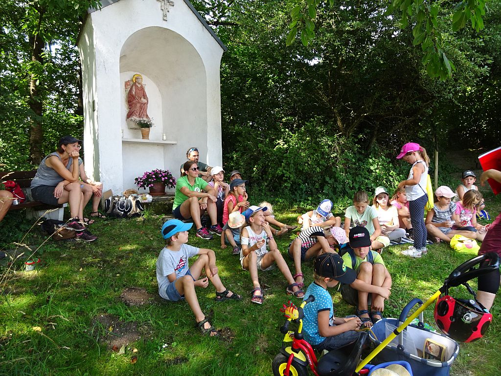 Nach mehr als einer Stunde Fußmarsch wurde an der Franziskuskapelle eine Rast eingelegt. Aber auch hier wurde von Miriam Stock weiter über die Ameisen unterrichtet und die Kinder lernten viel dazu und waren mit Begeisterung dabei. Danke an die drei Jugendbetreuerinnen und an Dr. Miriam Stock für diesen informativen Vormittag.
