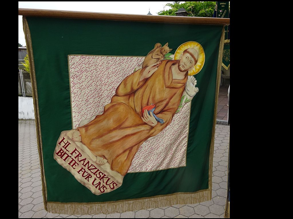 Unsere Fahne wurde am 15. August 1998 zum 90-jährigen Jubiläum geweiht. Hier die Vorderseite. Die Fahne wurde von Claudia und Michael Wurmer entworfen und haben bei der Bemalung mitgeholfen.