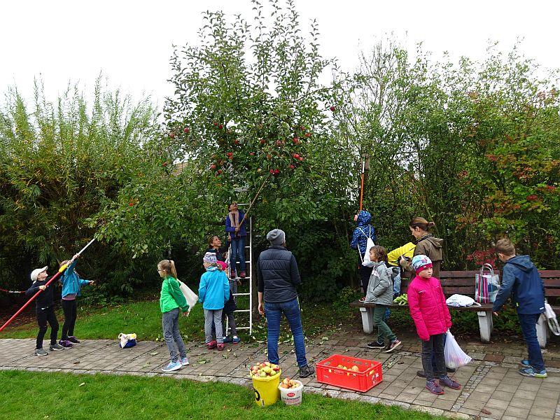 Bei der Apfelernte 2019 mit der Klasse von Kerstin Bringk waren die Kinder mit Eifer dabei und ernteten alle Äpfel der drei im Schulgarten stehenden Apfelbäume. Die Äpfel konnten die Kinder mitnehmen und haben diese auch den anderen Klassen angeboten, die rege davon Gebrauch machten.