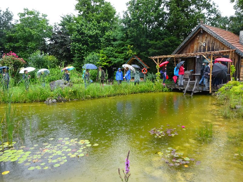 Trotz Regen besuchten interessierte Mitglieder die vier Naturgärten in Hausen Davon auch den Garten von Claudia und Michael Wurmer mit deren imposanten Schwimmteich