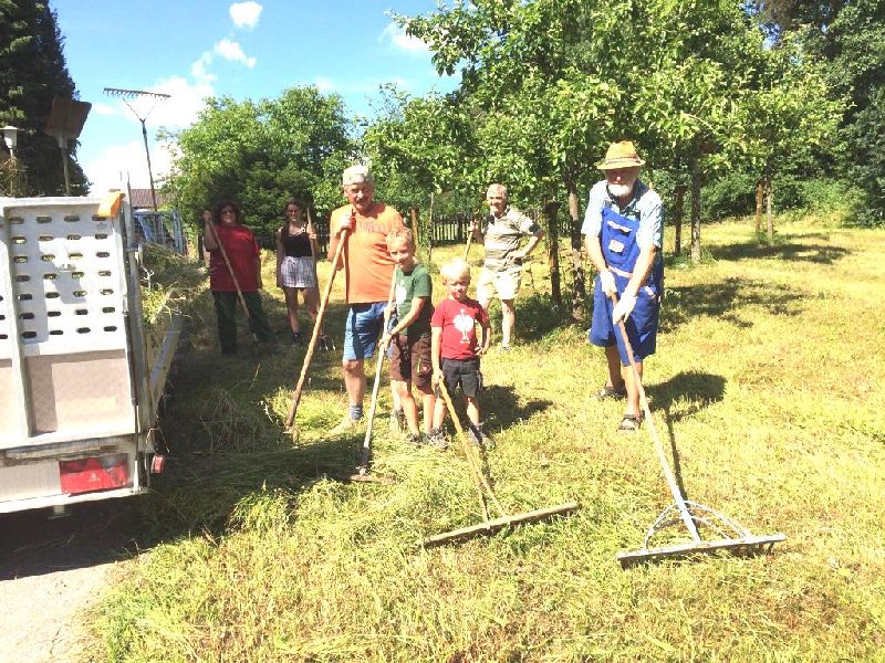 Am 26. Juni fanden sich fleißige Helfer um die von der 2. Vorsitzenden Sonja Karl gemähten Streuobstwiese das Gras zusammenrechen.