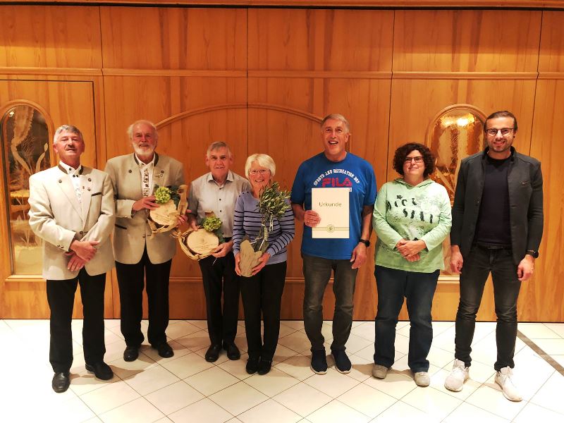 Bei der Herbst- und Hauptversammlung 2021wurden langjährige und aktive Mitglieder vom Verein geehrt. Johann Kolb 2, v l. Michael Biberger 3.v.l. erhielten eine Ehrenscheibe. Hildegard Lukas einen Blumenstock und Ernst Lankes die Bronzene Ehrennadel. Mit auf dem Bild links der neue 1. Vorsitzende Albert Uretschläger, rechts 2. Vorsitzende Sonja Karl und Bürgermeister Johannes Brunner